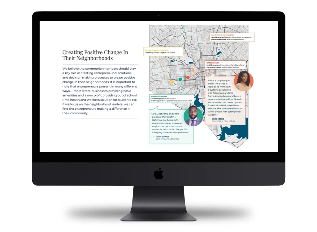 Designed and built a compelling, easy-to-navigate website that engages and informs diverse audiences, empowering social entrepreneurs and highlighting the organization’s impact in addressing Baltimore’s racial and spatial wealth divide.